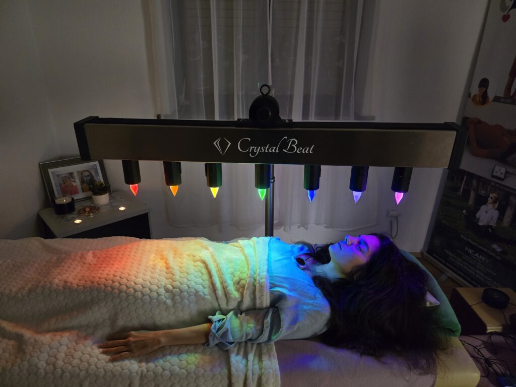 barvno in svetlobno frekvenčno terapijo ter srčni bio- feedback. Med seanso se z energijo vašega srca informira tudi steklenica z vodo, ki jo lahko vzamete s seboj in jo kasneje popijete za dodatno okrepitev zdravilnih učinkov. Crystal Beat povezuje delo s čakrami in srcem, kar omogoča sproščanje, usklajevanje uma s srcem, odpiranje, čiščenje in harmonizacijo čaker ter polnjenje telesa z energijo. Gre za celostno wellness izkušnjo, ki podpira vaše dobro počutje na več ravneh.