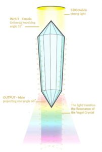 Barvna svetloba, ki sveti skozi posebne Vogel kristale, deluje na energijske centre, jih očisti, energizira in uskladi. To posledično uravnoteža vse vidike našega bitja, ter aktivira zdravilne psihosomatske mehanizme. Oblike kvarčnih kristalov so narejene po sveto-geometrijskih principih in med drugim vključujejo razmerje zlatega reza ter posebej izbrane kote dveh 12-straničnih piramid za usmerjanje svetlobe.